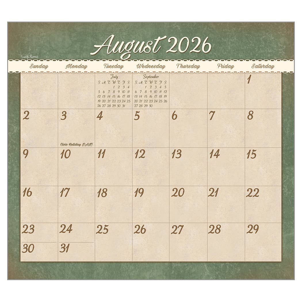 At Legacy, we believe life should be beautiful! Spend your year surrounded by unique art coupled with the organization of thoughtfully designed pages. Printed on premium linen embossed paper, our best selling calendars are reinforced with a brass grommet and are packaged in a fully designed protective paper sleeve, showcasing the cover, all 12-month images, and a sample calendar spread. Size: 13.375"x 12". Be sure to order by May 31st to get this amazing EARLY BUY pricing - regular price is $10.00 per calendar! Made in China.