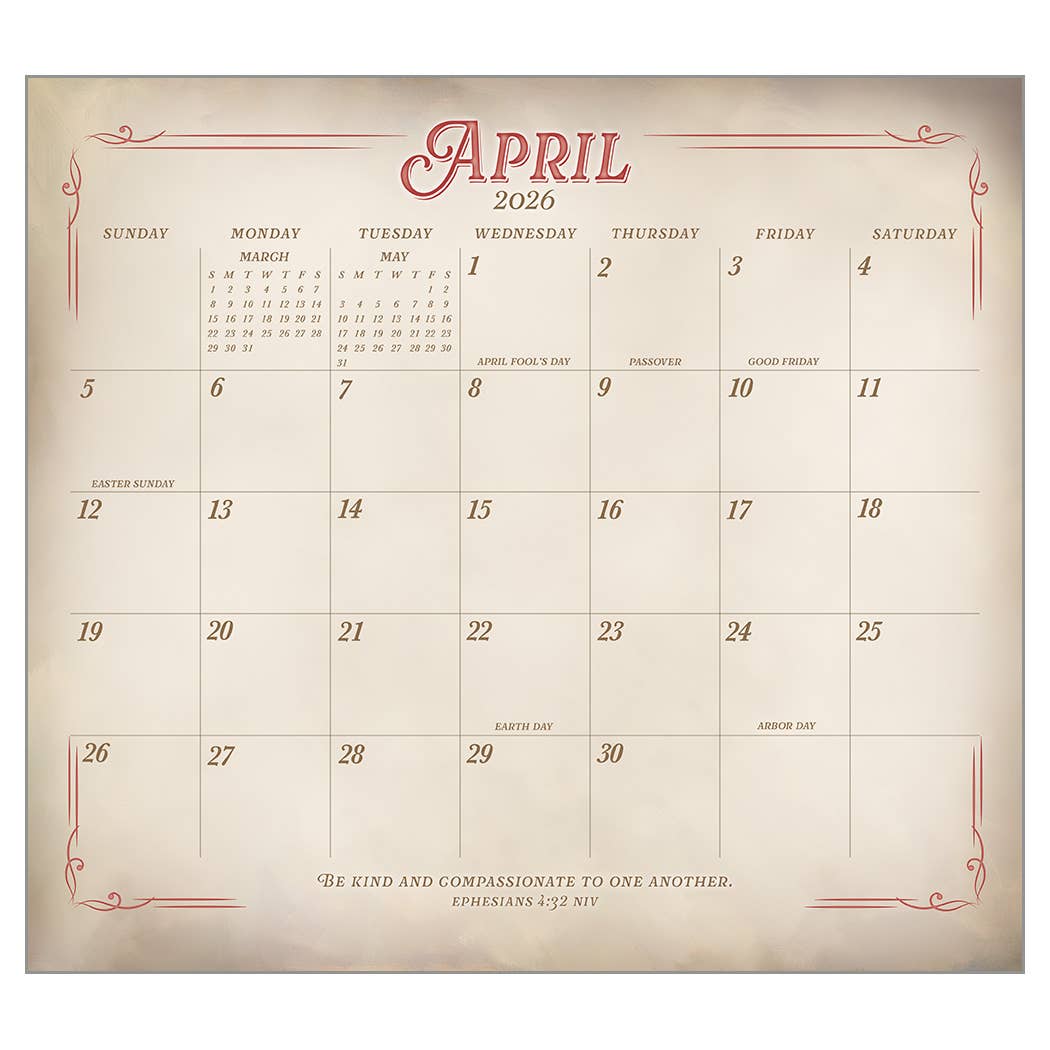 At Legacy, we believe life should be beautiful! Spend your year surrounded by unique art coupled with the organization of thoughtfully designed pages. Printed on premium linen embossed paper, our best selling Scripture calendars are reinforced with a brass grommet, feature a scripture on each month and are packaged in a fully designed protective paper sleeve, showcasing the cover, all 12-month images, and a sample calendar spread. Size: 13.375"x 12". Be sure to order by May 31st to get this amazing EARLY BUY pricing - regular price is $10.00 per calendar! Made in China.