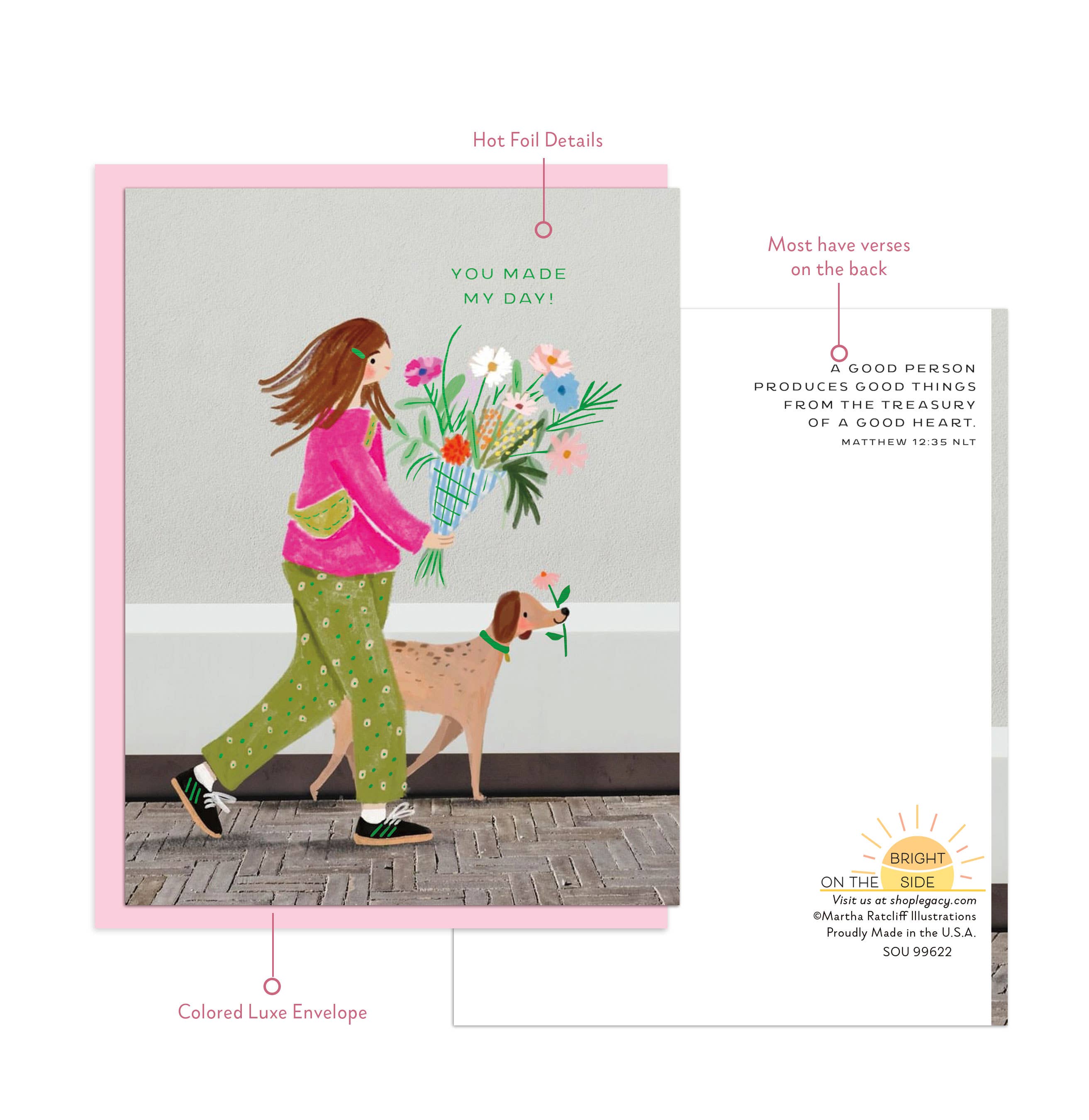 On the Bright Side’s Boutique Size Card is printed on high quality paper. It includes stunning Hot Foil Details and includes a Scripture verse on the back of the card. Comes with a Luxe Colored Paper Envelope and is packaged in cello. Card size: 4.25" x 5.5". Env: 4.3125" x 5.75" (A2). Made in the USA.