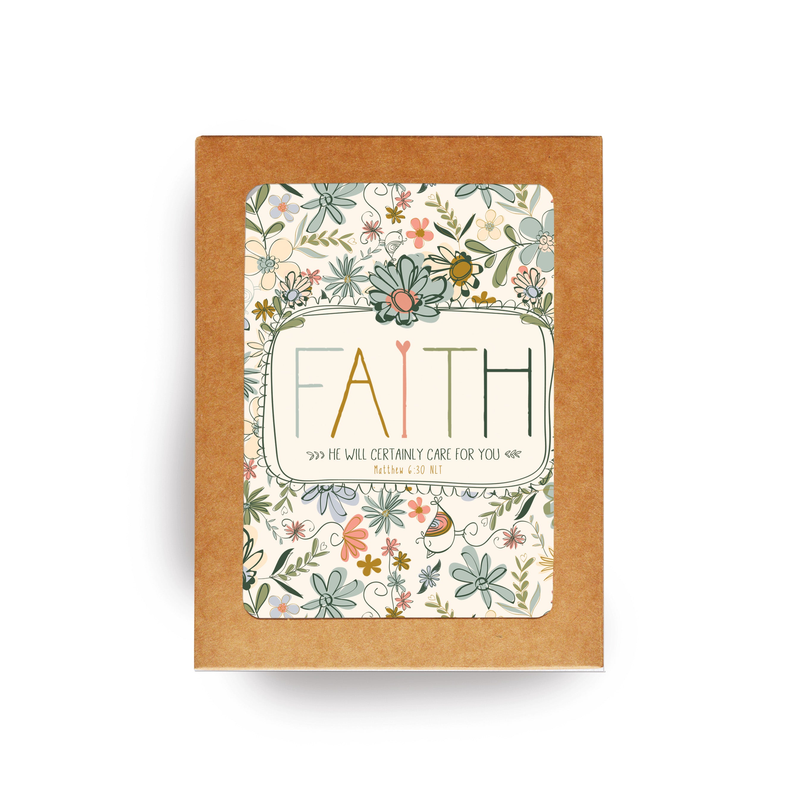 Legacy's Faith Notecards come packaged in a Kraft box with a clear acetate window. Each box contains 10 blank note cards featuring an inspirational scripture and 10 white envelopes. The cards are printed on 50% post-consumer/industrial recycled paper and are made in the USA. Card Size: 4.125" x 5.5".