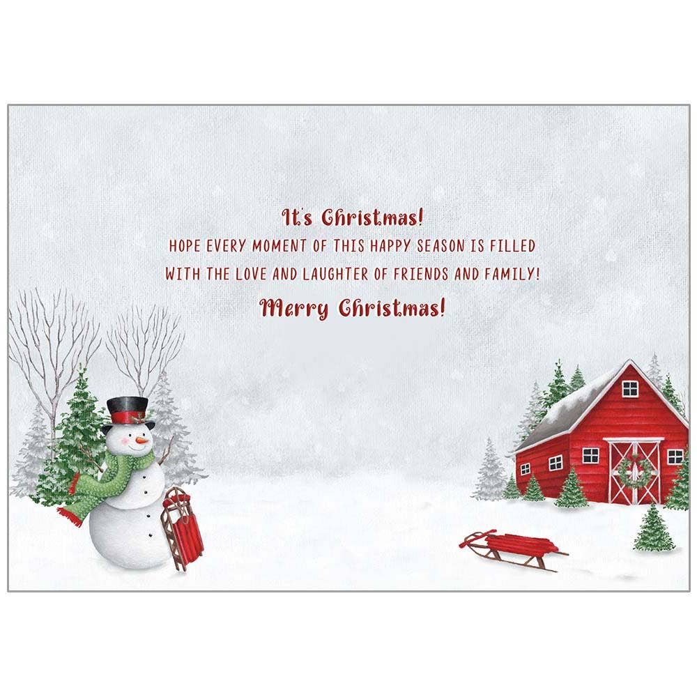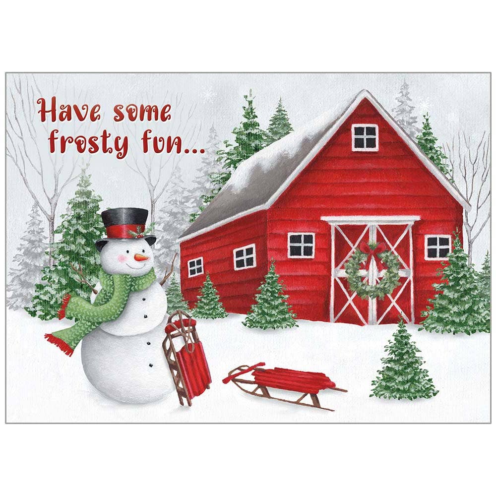 Snowman With Sleds at Barn Holiday Cards in a Box