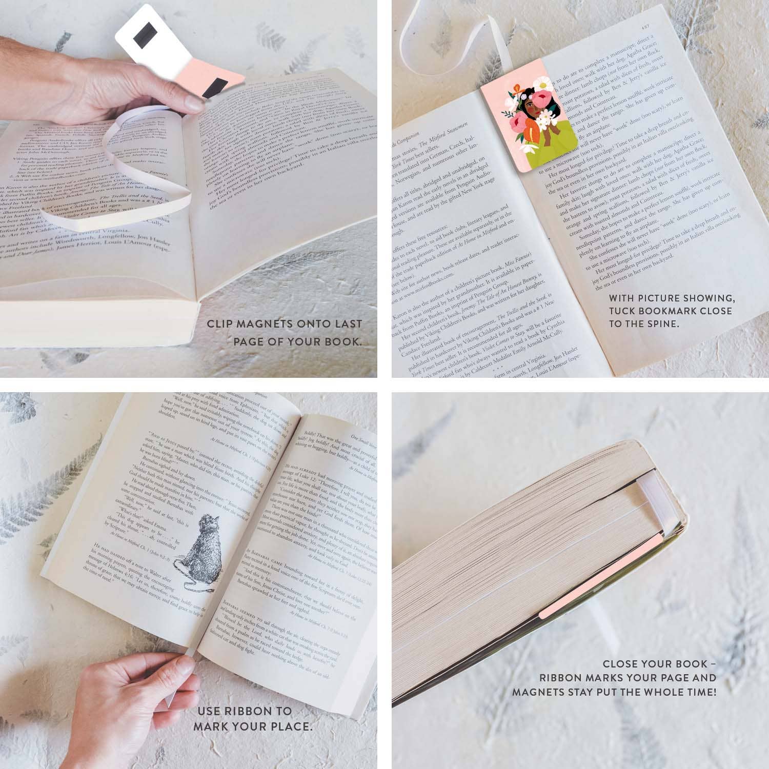 On the Bright Side's Ribbon Bookmarks are the ultimate bookmark! They’ll stay in your book until you've finished reading it and won't ever get lost. This sturdy, magnetic, laminated bookmark, clips right onto your back page. The attached coordinating ribbon will mark your place. It works with all types of books, even paperbacks. Size: 1 11/16" x 2 1/2" x 1/8". Made in the USA.
