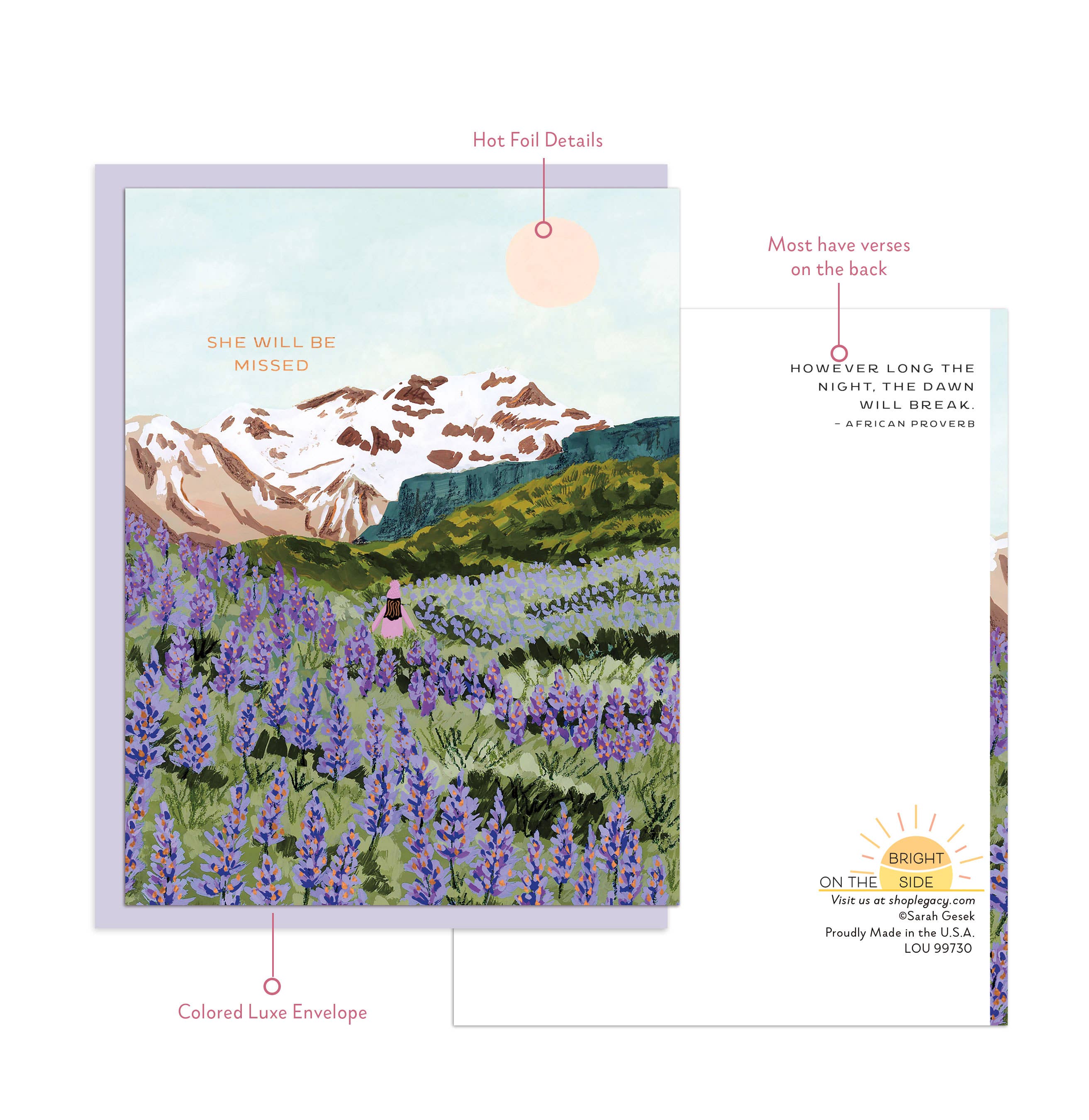 On the Bright Side's Boutique size cards are printed on high quality paper, include stunning Hot Foil Details and most include a bonus verse on the back of the card. They come with a Luxe Colored Paper envelope and packaged in cello. Card size: 4.25" x 5.5". Env: 4.3125" x 5.75" (A2). Made in the USA.