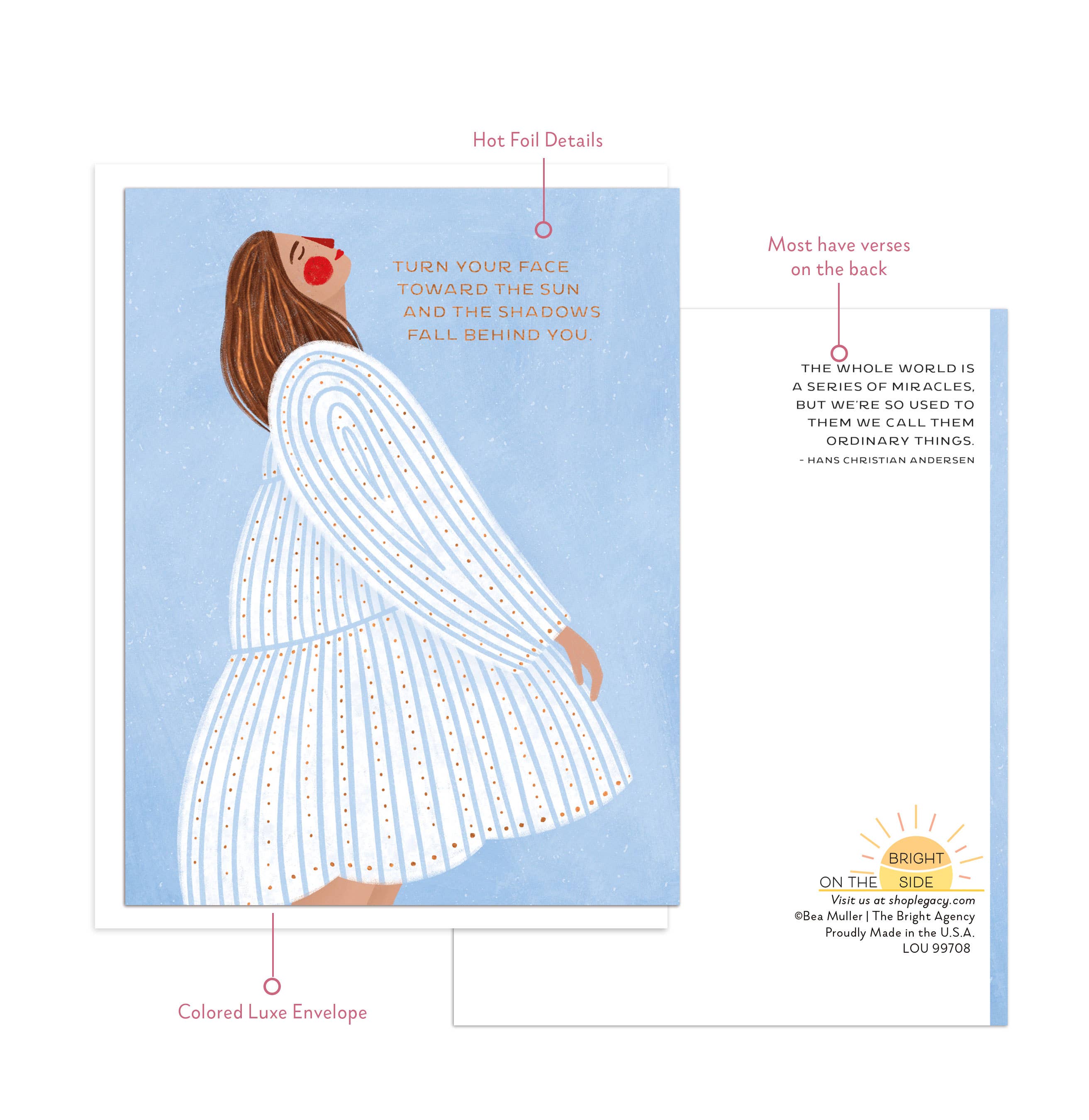 On the Bright Side's Boutique size cards are printed on high quality paper, include stunning Hot Foil Details and most include a bonus verse on the back of the card. They come with a Luxe Colored Paper envelope and packaged in cello. Card size: 4.25" x 5.5". Env: 4.3125" x 5.75" (A2). Made in the USA.