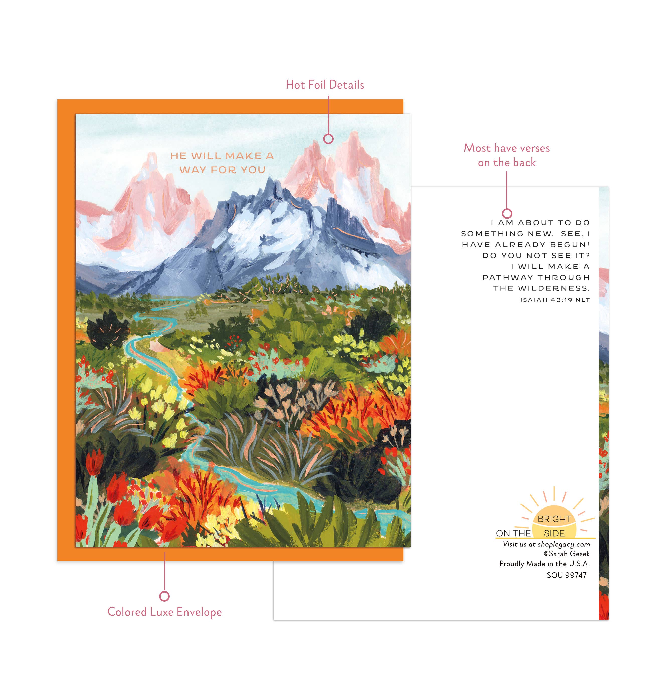 On the Bright Side’s Boutique Size Card is printed on high quality paper. It includes stunning Hot Foil Details and includes a Scripture verse on the back of the card. Comes with a Luxe Colored Paper Envelope and is packaged in cello. Card size: 4.25" x 5.5". Env: 4.3125" x 5.75" (A2). Made in the USA.
