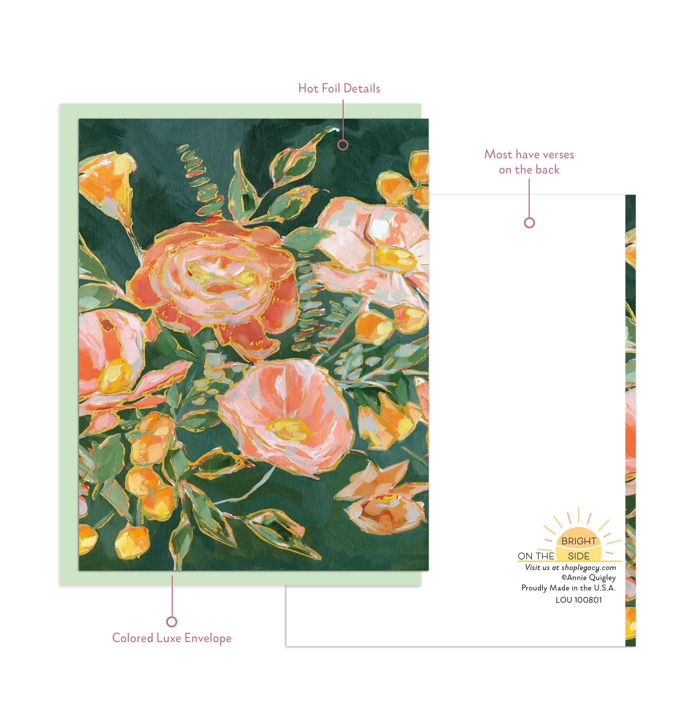 On the Bright Side's Boutique size cards are printed on high quality paper, include stunning Hot Foil Details and most include a bonus verse on the back of the card. They come with a Luxe Colored Paper envelope and packaged in cello. Card size: 4.25" x 5.5". Env: 4.3125" x 5.75" (A2). Made in the USA.