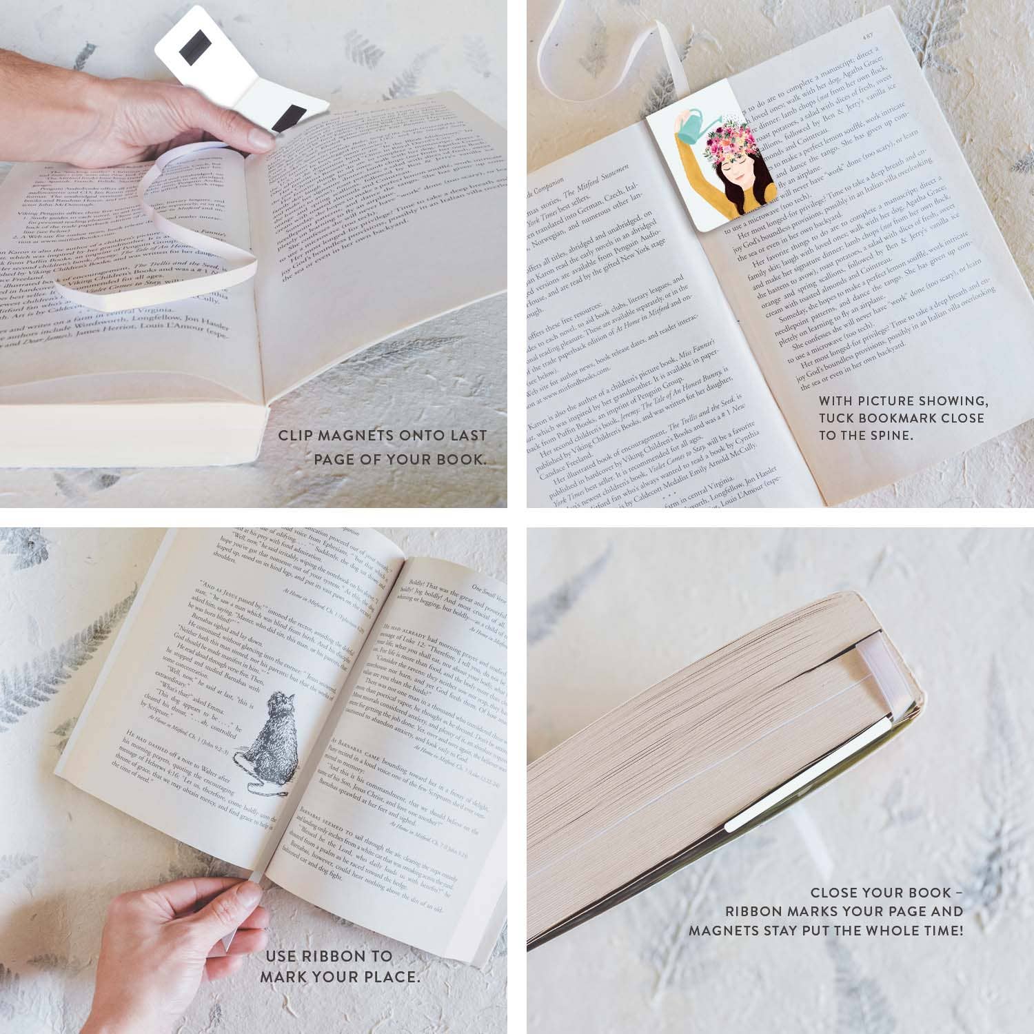 On the Bright Side's Ribbon Bookmarks are the ultimate bookmark! They’ll stay in your book until you've finished reading it and won't ever get lost. This sturdy, magnetic, laminated bookmark, clips right onto your back page. The attached coordinating ribbon will mark your place. It works with all types of books, even paperbacks. Size: 1 11/16" x 2 1/2" x 1/8". Made in the USA.