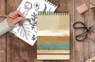 Our gorgeous New Sketchbook with Foil has a sturdy wire spiral binding on top so that it doesn’t impact your wrist while sketching or painting. The inside contains 128 perforated pages of cream-tone smooth paper that is heavy-grade acid free artist paper (160 gsm) perfect for pencils, ink, pen, charcoal and light watercolor. With a heavy duty hard front and back laminated cover, you can use it at home or on the go. The sketchbook cover is laminated and embossed with foil details and comes with an elastic closure to keep your sketchbook tidy and neat. Size: 7” x 10” Made in China.