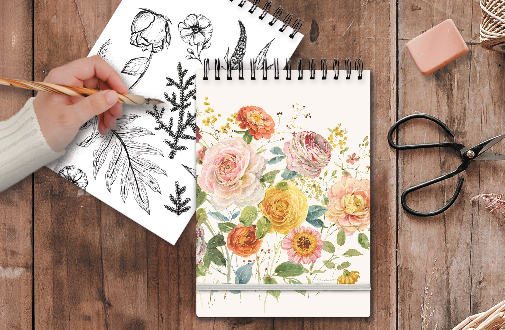 Our gorgeous New Sketchbook with Foil has a sturdy wire spiral binding on top so that it doesn’t impact your wrist while sketching or painting. The inside contains 128 perforated pages of cream-tone smooth paper that is heavy-grade acid free artist paper (160 gsm) perfect for pencils, ink, pen, charcoal and light watercolor. With a heavy duty hard front and back laminated cover, you can use it at home or on the go. The sketchbook cover is laminated and embossed with foil details and comes with an elastic closure to keep your sketchbook tidy and neat. Size: 7” x 10” Made in China.