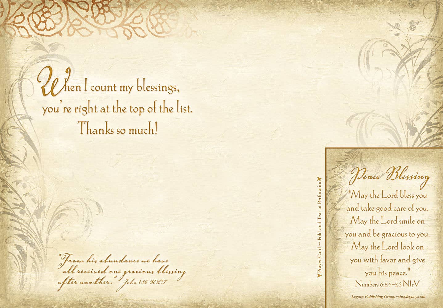 Legacy’s Prayer Greeting Card has inspirational artwork with scripture, a removable prayer card and a coordinating envelope. Simply tear off the prayer card at the perforation and tuck it into your Bible or wallet. It’s two gifts in one! Size: 4.875” x 6.75”. Prayer card size: 2 7/16” x 3 3/8”. Made in the USA.